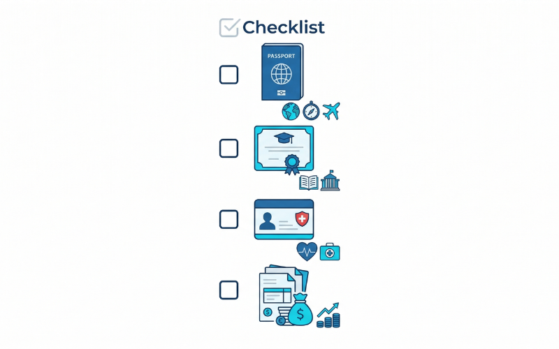 Dưới đây là checklist theo nhóm, giúp bạn soát hồ sơ trước khi nộp. Danh mục giấy tờ cụ thể còn phụ thuộc quốc tịch, bậc học và trường, và khi nộp trên ImmiAccount hệ thống sẽ gợi ý danh sách tài liệu cần đính kèm.